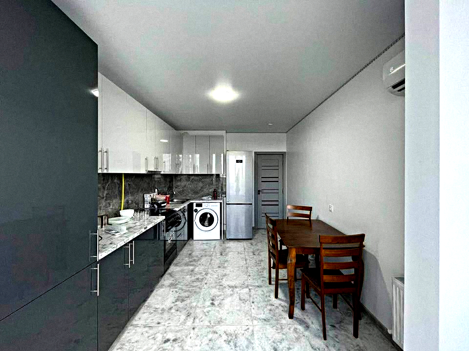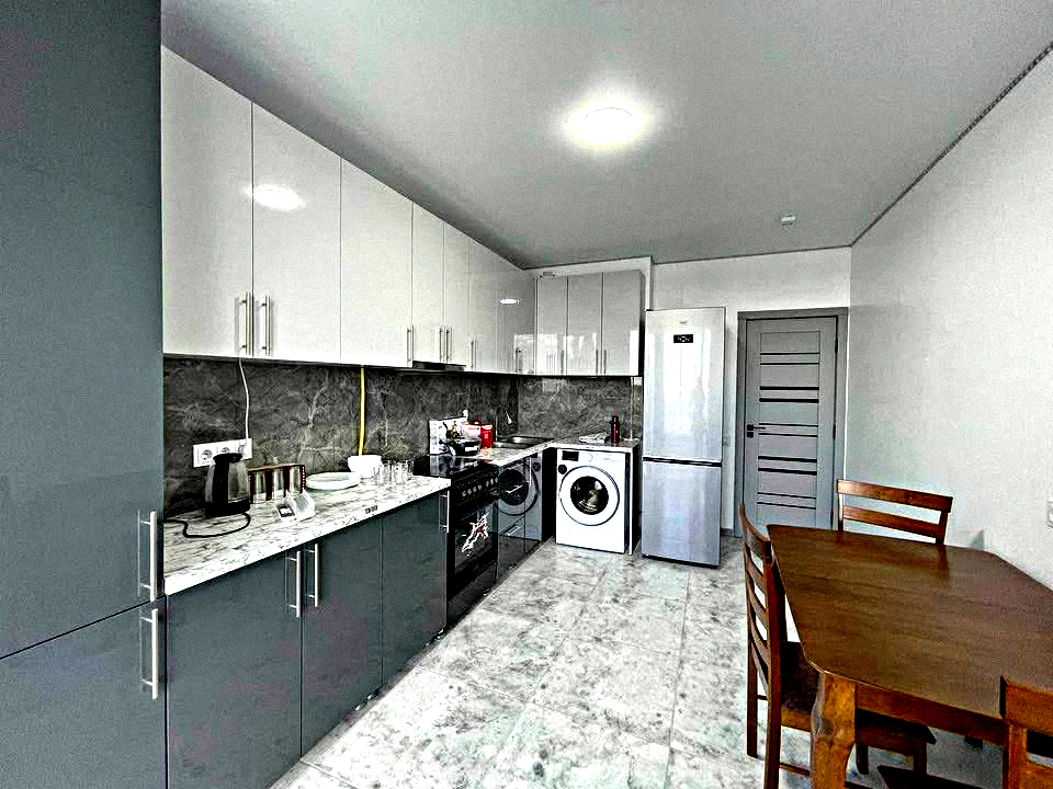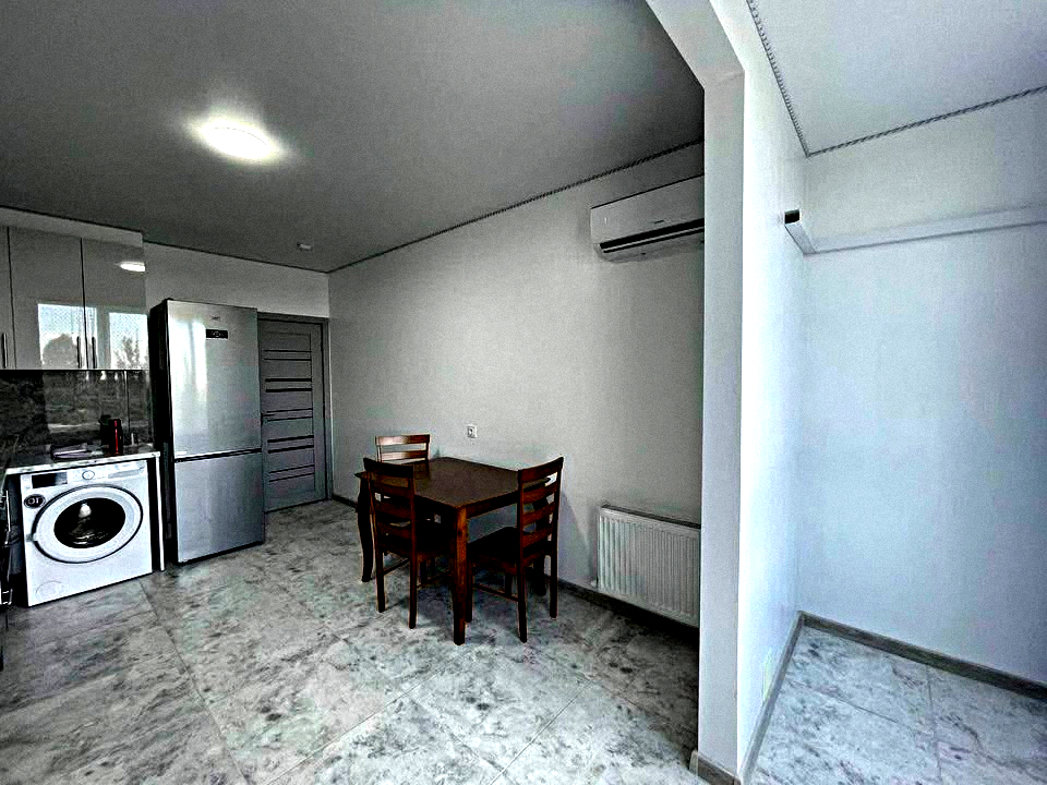 Kitchen: A sunny room with all necessary appliances, kitchenware, a dining table, a washing machine, and an air conditioner.