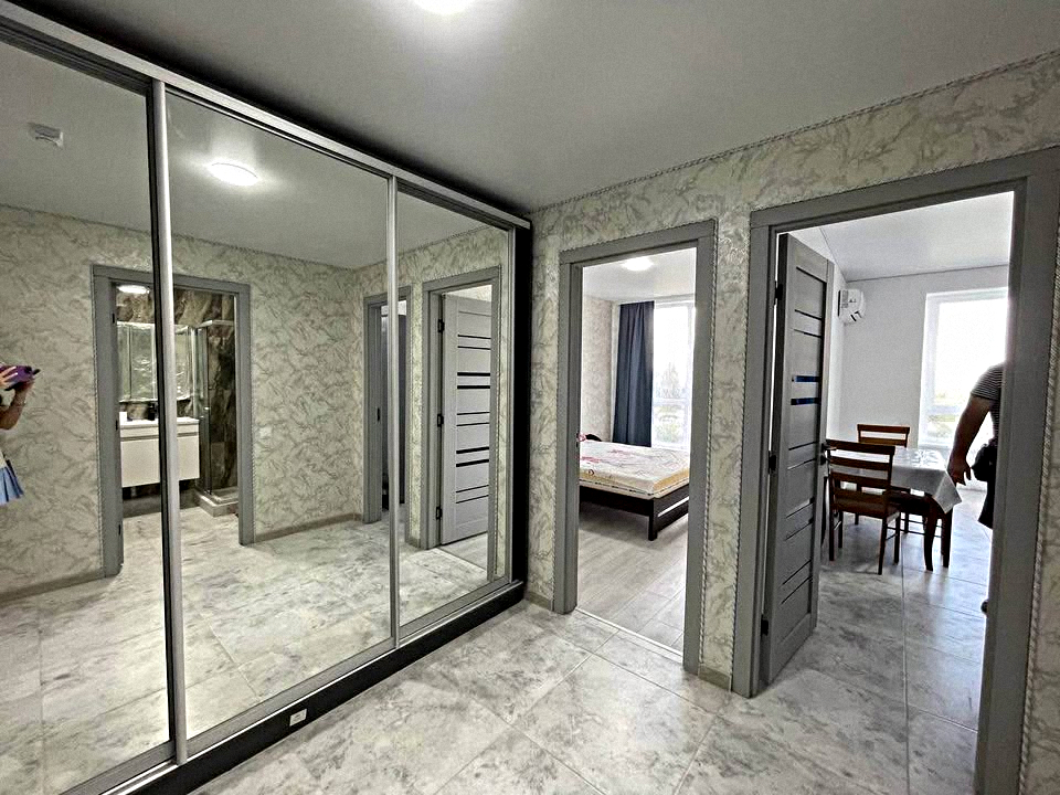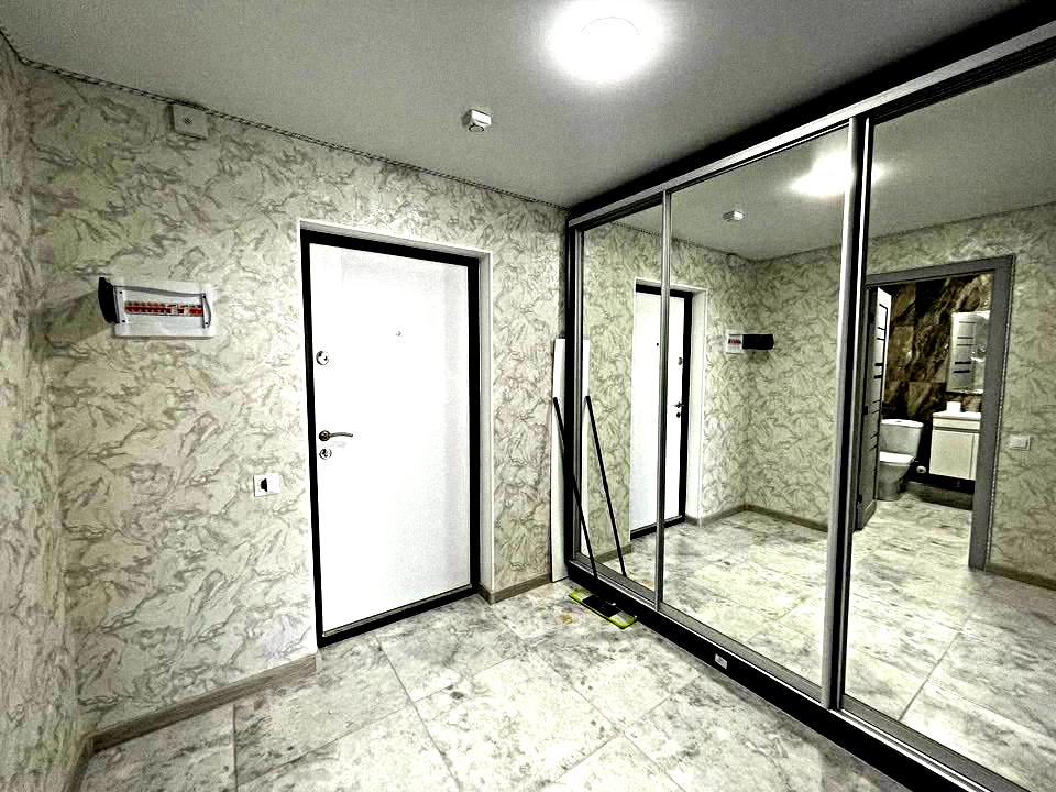 Bathroom: Equipped with a shower cabin, a sink with a mirror, and a toilet.