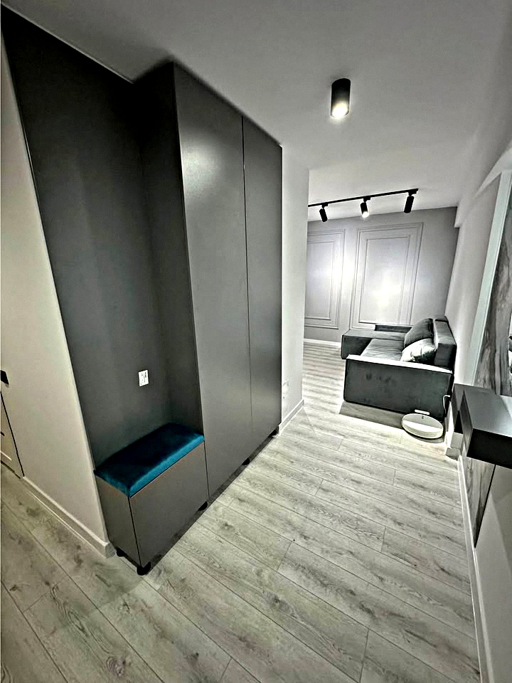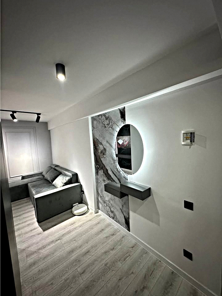 Living room: A spacious room with a large sofa, a wardrobe, and a Smart TV.