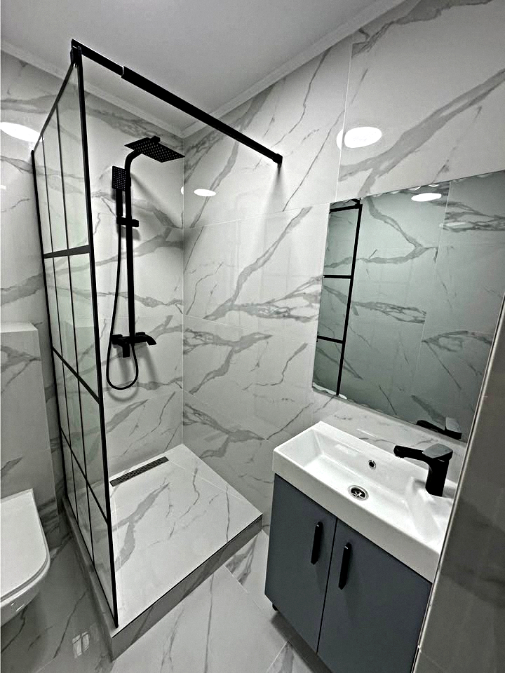 Bathroom: Equipped with a shower cabin, a sink with a mirror, and a toilet.