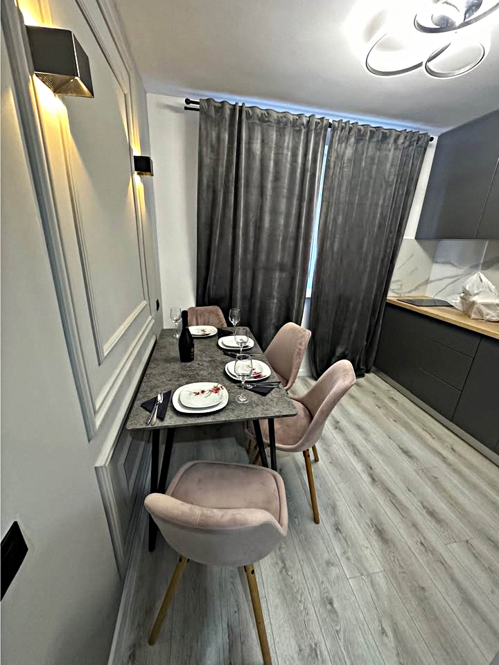 Kitchen: A sunny room with all necessary appliances, kitchenware, a dining table, a washing machine, and a Smart TV.